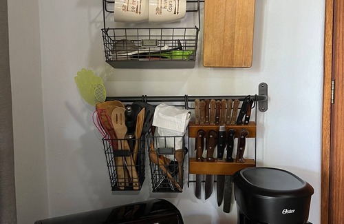 There are two kitchens: Inside, a four-burner gas stove, oven, and small refrigerator. Outside, a gas grill, sink, and plenty of work space.