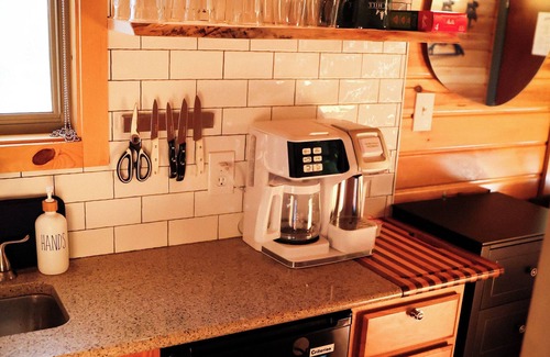 The cozy space is less than 150 square feet and is furnished with a full size pullout couch, a lofted king bed, small kitchen, and small bathroom with compact shower (it is small, but runs on a regular drain/septic) and flushing toilet (no smelly RV toilet here!). Inside the kitchen , you will find silverware, pots and pans, plates, bowls, cups and mugs, bottle opener, a 2 burner electric skillet, large toaster oven capable of cooking simple meals, coffee maker with built in single pod maker. We have also provided extras for your stay, including salt and pepper, olive oil, coffee, coffee pods, and individual creamers. There is also a mini-fridge.