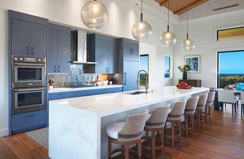 Welcome to Ke Kai Nui (“The Great Sea”), an extraordinary 4-bedroom, 4.5-bath island sanctuary in the exclusive community of Kukuiʻula, on Kauaʻi’s spectacular southern coast. With its soothing blue tones and coastal touches throughout, the home embodies luxurious ease and conveys respect for the ocean that surrounds it. Every aspect of Ke Kai Nui’s interior design was carefully conceived by Pillpotts Interiors to create a relaxing retreat.