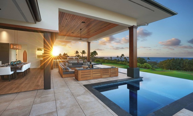 Outdoors at Ke Kai Nui, guests will find sprawling lanais, a lush green lawn, an inviting hot tub, and a sparkling infinity pool overlooking the golf course and the ocean. An outdoor living room has been outfitted with more lounge seating, another large flat-screen television, and an open-air kitchen with a built-in barbecue grill. A cozy firepit area serves as an ideal setting for sipping cocktails and appreciating the dazzling night sky.