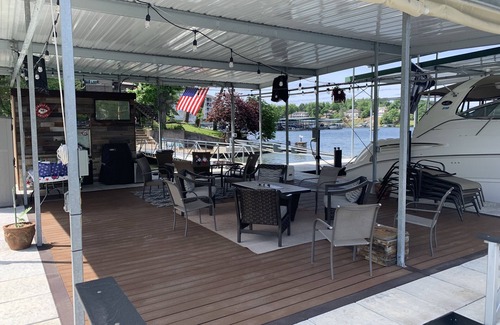 The Luxurious Master suite, panoramic lake view and spa-like master bath has a King size bed and Queen futon. A 65" Flat-screen smart TV and an AMAZING view of the Main Channel with your own private sliding glass door that leads out to the 1,000sqft deck which is lake front and a warm hot tub!