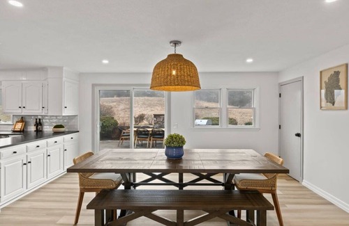 Upon entering the house, you will find the first of two living rooms. This one has a large sectional sofa and four chairs that accentuate the beautiful hardwood floors and the large bay window. Set up to have separate seating areas for intimate conversations, everyone can have their own space or gather all together in the large, open room. You’ll also find a large mounted Smart TV so you can log into your streaming apps such as Netflix, Hulu, Amazon Prime, etc.