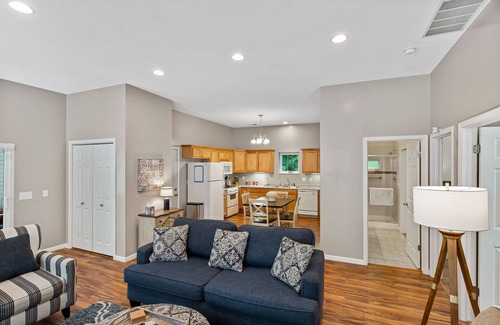 The house has multiple living areas. The main house has a three bedroom/two bath main floor area with open kitchen/living/dining room, large closed in deck for group dining, laundry room and large main suite. Downstairs is an expansive game room and den with ping pong and foosball tables, a 65" TV and three sofas, a bunk room that sleeps 10 with private bath, plus a half bath and a large screened porch with outdoor living area that overlooks the pool. Attached and accessible from either inside the house, through the garage or separate outdoor entrances is a two bedroom, one bath apartment with its own open kitchen/dining/living area, washer/dryer and private screened porch.
