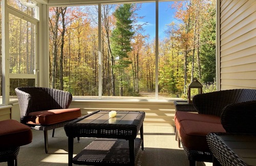 The in-ground pool with tables, umbrellas and chaise lounge chairs is in a large fenced back yard with kids' play area and great afternoon sun exposure. The yard is surrounded by dense woods that offer complete privacy.
