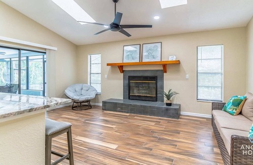 - Direct access from the living room to the covered lanai with an outdoor dining table and ceiling fan. It’s all screened in to keep pests out so you can dine comfortably and keep an eye on the action in the pool!
