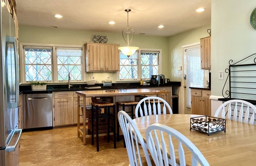 • Kitchen: island seating, breakfast area, granite countertops, oversized sink, stainless Bosch appliances including convection oven and induction cooktop, wide assortment of kitchen essentials, quality cookware, tableware, utensils, small appliances