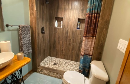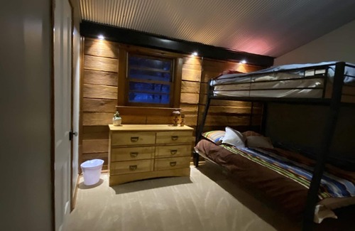 Newly added Sports room. This space would be perfect for any sports enthusiasts. 2-75" smart TV epoxy floors for easy clean up, couches recliners, and full bar area with stools. This place is very unique. We own the entire lake. It is remote and private. It is a spring fed lake that is clear clean and deep. Fishing galore, hiking, camping, paddle boarding, kayaking, with amenities of a log house, over looking a beautiful 8.5 ac lake. The 8 person hot tub also over-looks the lake to make a beautiful evening sit.
