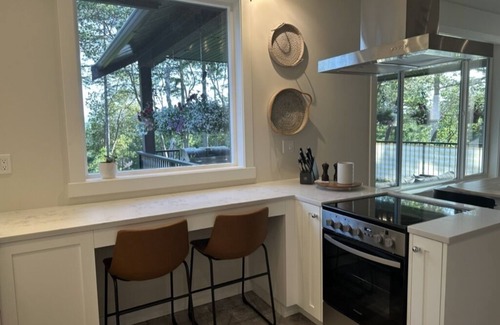 The full kitchen has everything you need, including condiments and breakfast items. There is a full sized BBQ on the private deck. Enjoy a hot rain shower before savouring your tea or Nespresso coffee on the balcony overlooking the Arbutus and Garry Oak forest.