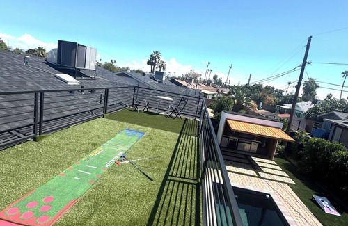 Spacious Scottsdale getaway just 5 minutes from Old Town. Perfect for families and friends, this modern home offers 3 bedrooms, an office with a futon, and 2 full bathrooms. The open living room features two kitchen islands, a pool table, a TV, and an oversized couch. Large glass sliding doors open to a private backyard with pool, hot tub, ping pong table, balcony seating, and a covered outdoor kitchen with multiple lounge areas—perfect for relaxing or entertaining under the desert sky.