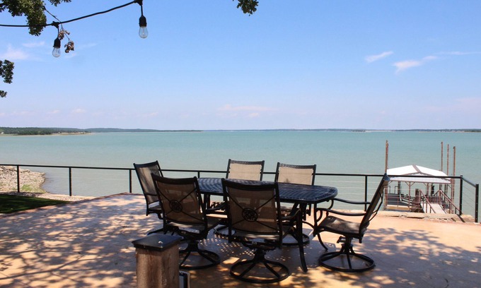 Distinctive, secluded, hillside waterfront retreat nestled in the trees with unparalleled views of Lake Bridgeport located in Runaway Bay, TX. This 5 bedroom, 4 bathroom home was built for entertaining and includes a large game room with a pool table, shuffleboard, foosball table, and poker table. The poker room can actually be used as a 5th bedroom with a sleeper sofa. Enjoy the sunrise/sunsets overlooking the lake while lounging on the deck, concrete patio or platform over the water. The upper deck extends the length of the back of the home and can be accessed from the Master Bedroom or the Living Room. The lower patio can be accessed from the Game Room or Poker Room and includes an outdoor hot tub. The main living area combines the dining area, kitchen and TV area creating one large area to gather for family and friends and has great views of the lake. The home sleeps a total of 15 with three king beds, a twin over queen bunk bed, queen sleeper sofa, 2 chair beds, 2 twin mattresses and a sleeper sofa. Your own private boat dock is available to tie your boat or watercraft to or use for swimming and fishing. There is also a sidewalk that takes you down to the shoreline. There is also an outdoor combination grill that uses propane on one side and charcoal on the other. The charcoal side includes a smokebox for smoking meats. This home is like being on a small ranch with total privacy from your neighbors.