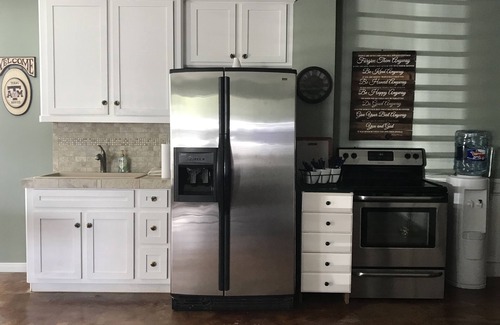 PRIVATE-SECLUDED getaway. WIFI Hot Spot - 1200 sq. ft. home for the outdoor lover on 10 acres. The one acre pond for fishing and swimming. Shooting range, bar-b-que pits for outdoor cooking. Complete kitchen with side by side refrigerator/freezer, coffee pot, toaster, dishes, pots and skillets. Large dining table with 6 chairs. Very secluded. You will see cows, donkeys, horses, maybe a few deer and a few cars at a distance. Fishing pier. The house is approximately 30X40 with french doors going to the patio and the pond. Large picture windows for great outside viewing. French doors going to the spacious bedroom with queen size bed and an attached bath for your privacy. Drinking water dispenser, coffee, creamer. Bring your fishing poles/bait, shooting gear & food. (Please pick up your brass) Queen bed, private bedroom, two couches and a recliner.