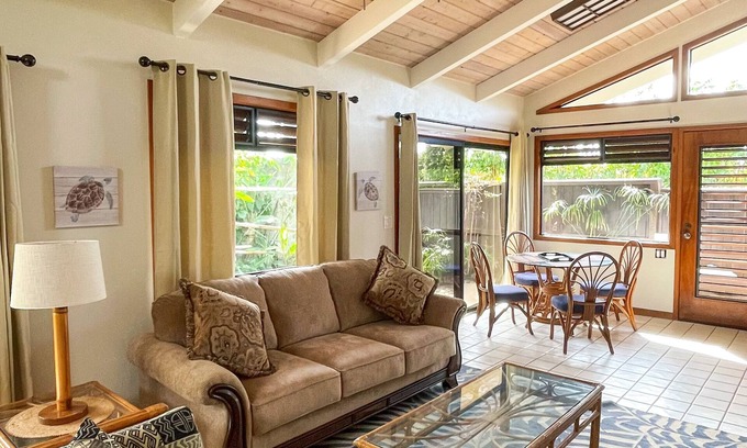 Poipu Beach Ohana house, called “Pua Hale” (Flower House), is an 850 sf one-bedroom private cottage and tropical garden completely enclosed by private walls and fence. Located on Kauai's sunny and warm Southern shore is an easy 10 min walk or slow 3 minute drive from sandy beaches, snorkeling, surfing, and beautiful sunsets. Often sea turtles and monk seals can be watched resting on the beach. Also within walking distance or short drive are many restaurants, shopping, and more.