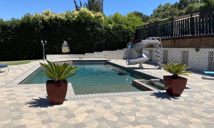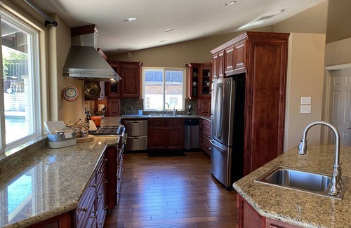 Welcome to our home in Escondido. We are freeway close but very private and serene. The single-story house has 3 bedrooms and 2 baths with a remodeled, entertainers kitchen that opens to a great room. There is a bar, table and seating area with gas fireplace. The TV room also has a fireplace and comfortable seating. The backyard is lovely with a large grassy area, seating, teak dining set, salt water pool and spa and large tree to provide shade. You are welcome to pick oranges, grapefruit, avocados and guava (when in season) from our mature fruit trees.