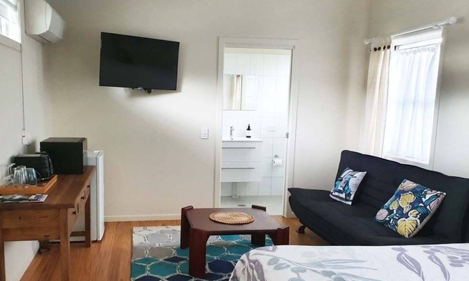 The room contains air-conditioning, a ceiling fan, dimmable lights, flat-screen TV and wifi. While there are no kitchen facilities in the room, there's a microwave, toaster, fridge (with an introductory milk and water) , kettle, tea, coffee, glasses, cups crockery, cutlery and a breakfast tray, The main house also has a beautiful new updated kitchen which can also be used if required.