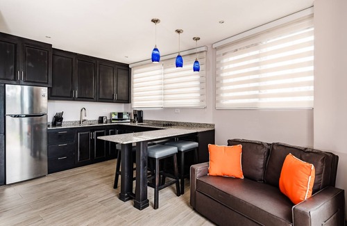 This gated residence with security cameras is a short 0.3mi (500m) walk to the beach and downtown with several great restaurants only 300ft (100m) away. Also, within a block of the house, you can find a grocery store, bank, gym and pharmacy. Throughout the day, there will be staff cleaning and maintaining the property to ensure that you have the best experience possible. Complimentary concierge service is included. Our house manager will greet you upon arrival and is just a phone call away to answer questions or address any issues that you may have. The enclosed two car garage will also be available should you rent a car or golf cart. This home comfortably sleeps up to 16 people but can accommodate up to 19 with sofa beds.
