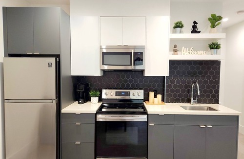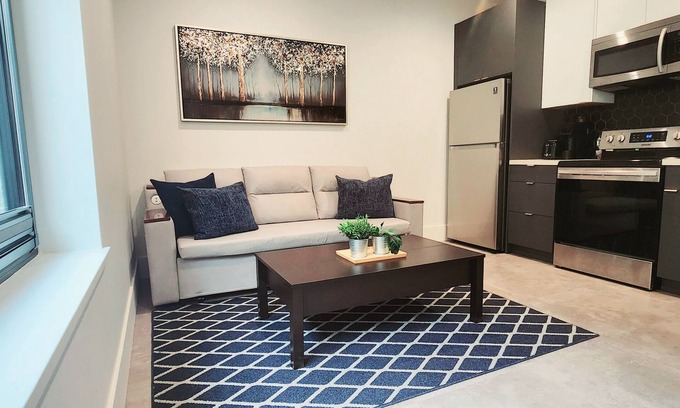 This well-appointed & stylish one bedroom + one bathroom, boosts an open-concept layout with high-end finishes, brand new king bed w/ medium-firm memory foam mattress and modern appliances. This immaculate and vibrant space is draped in natural light with elegant high ceilings, oversized windows & radiant-heated floors. Curate your perfect ambiance with guest-controlled temperature and LED dimmer lights in the bedroom.