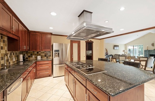 Outside gas and charcoal grills. Wonderfully landscaped backyard with lighted swimming pool. The property is totally private.