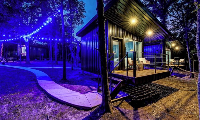 Each of the four cozy treehouse-style cabins sleeps 2 guests (8 total), featuring a plush king bed, mini fridge, microwave, Keurig coffee maker, TV, WiFi, and a private porch. Every guest also enjoys their own private, keyed bathroom in the bathhouse, complete with a walk-in shower, vanity, and toilet. We can approve extra guests for a fee (kids that may sleep on an air mattress or pack n play*)