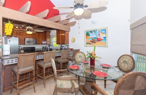 This villa sleeps 6. It is tucked away in a quiet tropical well manicured setting, it has plenty of indoor and outdoor living space, with a very large screened in lanai and open patio with outdoor dining table for outdoor meals. The space makes this very comfortable for everyone to spread out. On the main level, the master bedroom with king size bed, with a large, private on suite bathroom. Also on this level is a large kitchen, dining and living areas.
