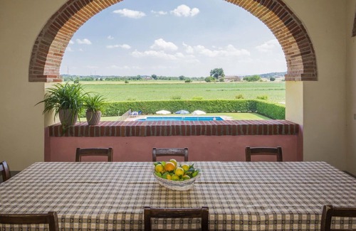 This beautiful farm house with a characteristic pigeon-loft has been recently renovated and is perfect for a relaxing vacation. It is surrounded by many sunflower fields and has large outdoor areas with a wood burning oven, a gazebo, and a porch with a barbecue, pizza oven, dishwasher, and a working top for eating al fresco near the swimming pool. The property is enclosed by automatic gates and offers total privacy because the annex next to it is not for residential use. The interiors are evocative of a period house with a spacious living room with fireplace, big dining table, terracotta floorings, and high beamed ceilings.