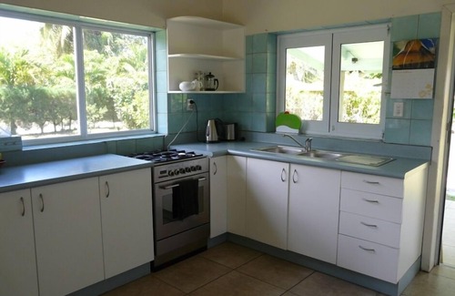 Large lawn with gardens, fruit trees, spacious tiled verandahs front and back for outdoor living, gas BBQ, outdoor furniture and loungers. Enjoy breakfast on the tiled verandah with beautiful mountain views ... wander 50 metres along the beach for Sunset cocktails at Manuia Beach resort .. eat out or in, meal-making's a pleasure in the bright convenient kitchen, the choice is yours. Be as lazy as you like in paradise!