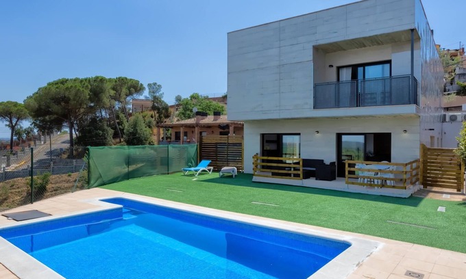 The exclusive 280m2 villa is in a quiet natural area called Fogars de la Selva just 15km from the beach, 20min from Blanes and 25min from the Airport of Girona. It is distributed on two independent floors with a large garden area and private pool 6x4x2m with hammocks for sunbathing and a barbecue equipped with grills. On the ground floor there are 2 bedrooms with a double bed and two single beds, as well as 1 bathroom with a shower. On the first floor there are 3 additional bedrooms all with a double bed and two more bathrooms with hydromassage bathtub and shower. It has a fully equipped kitchen with washing machine and dishwasher, Nespresso coffee machine, air conditioning, heating and fireplace for winter, flat screen TV with streaming service (Netflix), Wi-Fi throughout the establishment, sheets and towels included and a garage with capacity for two cars. Key collection takes place in the same house from 4pm to 9pm with an option to extend. It is a smoke-free establishment and pets are allowed at an additional cost. At the check in we will ask for the tourist tax of 1.00 x person x night and the documentation and we don't accept groups under 30 years. We will be at your disposal almost 24h for anything you may need during the stay.