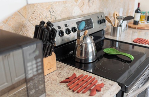 Craft homemade meals in the fully-stocked kitchen. Enjoy romantic dinners in the lavish dining room. Unwind in the fresh, tropical Boho-inspired interior.