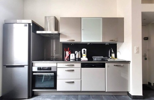 The living room, bathed in light, features a comfortable sofa bed for your nights, while the kitchen area is fully equipped for your meals: oven, stovetop, refrigerator, dishwasher, coffee maker, kettle, and toaster. Please note, however, that there is no microwave due to limited space. The well-appointed bathroom includes a shower and toilet.