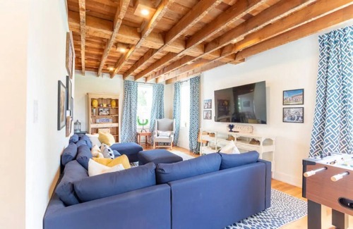The house boasts A HIGH-END KITCHEN, exposed wood BEAMS, MULTIPLE GATHERING PLACES, AN OUTDOOR FIRE PIT AS WELL AS foosball and shuffleboard tables, super-fast commercial-grade Wi-Fi with 12 smart TVs connected to all streaming apps, and the ability to synchronize across the first floor to catch every minute of the big game!