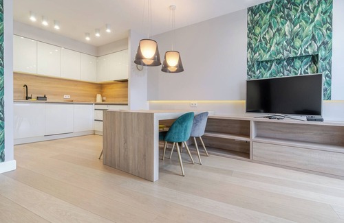Pułaskiego Urban Apartment consists of a living room with a kitchenette and sofa, a bedroom with a king-size bed, a bathroom, and a spacious balcony where guests can relax and enjoy their morning coffee or an evening glass of wine. The apartment is equipped with Wi-Fi, cable TV, a refrigerator with freezer, stove, oven, kettle, dishwasher, and washing machine. Additionally, guests have access to an iron, vacuum cleaner, and hair dryer. A parking space in the underground garage is also provided.