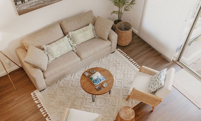 Large dining and living rooms with elevated ceilings make this spacious unit feel that much more comfortable. The living room couch also offers a pullout queen mattress. An office/work area under the open stairway and additional desk in the bedroom offer plenty of spots to setup and work (if needed). New appliances as of November 2023