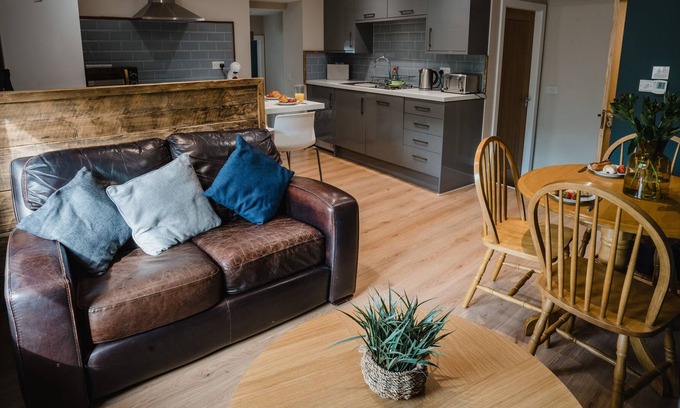 The open-plan living space includes a kitchen with electric oven and ceramic hob, microwave, fridge/freezer, dishwasher, washing machine, a sitting area with Smart TV and a dining area with seating for three. The bedrooms include two doubles, one with en-suite shower. To the outside is roadside parking for two cars. Within 0.1 miles there is a shop and pub. WiFi, fuel, power, bed linen and towels are included in the price. Pets and smoking are not allowed. Pule Hill is a lovely escape for families or two couples, whatever time of year.