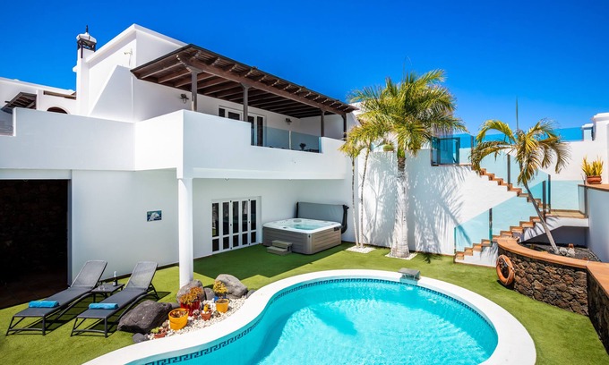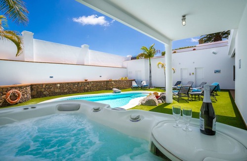 VILLA JOLE is pure luxury, it is finished to a high specification with all the mod cons and offers a fantastic space for a great holiday. The villa sleeps 8 and has 4 large bedrooms with king size beds. 3 of the 4 bedrooms have en-suite bathrooms. It is situated in the luxury development of Puerto Calero. Puerto Calero is regarded as the most up-market residential enclave on Lanzarote. Today, Puerto Calero boasts great restaurants, up scale shopping and the best selection of luxury property anywhere on the island. VILLA JOLE has a private garden with a salt water heated pool that is heated all year around at no extra charge. A top of the range designed hot tub for 7, Large BBQ area, Fibre broadband, UKTV and all SKY channels including films and sport, 2 x DVD players, and XBOX. Coin operated AirCon in the 4 bedrooms, , Lounge with wall hung 65” flat screen tv. A highly appointed kitchen with Fridge/Freezer. Dishwasher, oven, hob and Hood plus microwave. Covered veranda with table and chairs for outdoor dining and a corner suite for relaxing, another outside terrace to soak up the evening Lanzarote sun, a utility room with washing machine, iron and ironing board and outside space with rotary line. Games room with pool and table tennis tables. Large tv. Poolside there is a kitchen, wet room, bbq area and hot tub. Situated 5 minutes walk from the marina and beach, 10km from arrecife airport and 5 minutes drive from Puerto del Carmen. 24 hour security guarantees tranquillity and peace of mind. Each booking will include a welcome pack of necessities for your convenience. VILLA JOLE HAS A FULL TOURIST LICENCE Vv-35-3-0002338 PLEASE ALSO NOTE FOR SECURITY I AM UNABLE TO REPLY TO EMAILS WITHOUT A CONTACTABLE TELEPHONE NUMBER.