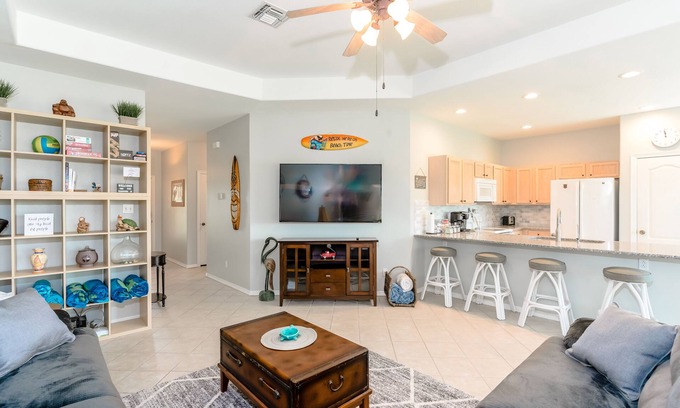 Welcome to Putter's Paradise; a beautiful Golf Villa located at the 18th tee box! This Fabulous Villa features 3 bedrooms (K, Q, 2 Twin XL), 2 baths (5 piece primary and full 2nd bath) and all the luxuries of home! The Villa is furnished with everything you need for a relaxing tropical getaway so pack light! What we offer: Ceiling fans and TV's in the living room and all of the bedrooms. A stocked kitchen that boasts granite counter tops, a microwave, large refrigerator with ice maker, dishwasher, electric stove, filtered water tap and includes a hot drink station with a Dual Keurig coffee maker, ground coffee, coffee pods, tea packets, sweeteners and powdered creamer. The dining area has a nice sized table with seating for 6 and is great for playing games. Oh did we mention that there is a variety of board and card games provided! The bathrooms are stocked with shampoo, conditioner, body wash and a hair dryer. Of course bath towels, hand towels, washcloths and makeup towels are also provided. Sit back and relax in the screened in porch that faces the 18th tee box. It is fun to watch and wave at the golfers and they go by. This is also excellent for sipping your morning coffee and watching the sunrise. There is a gas grill if you're in the mood for grilling! In the laundry room you will find a washer/dryer, laundry pods and fabric softener sheets. This is also where you will find the beach and pool items which you are welcome to use. There are lawn chairs, coolers, beach bags, noodles, sunscreen and bug spray. There are also plenty of beach towels! While the garage is not available for guest parking, there are 2 parking spots in front of the garage and an additional parking spot off to the side. What more could you want? Well how about access to 2 swimming pools, tennis court, fitness room, clubhouse, onsite dining AND an 18 hole professional golf course (with fee) all in a quiet, relaxing gated community. Nearby attractions include the beach, great dining options, museums, shopping, dolphin watching, fishing, parasailing, shelling, bird watching, horseback riding, wild life preserve and much more. You can even take a short drive and spend the day in Nuevo Progreso, Mexico (passports encouraged for ease of reentry into the US however you can gain entry with just your ID).