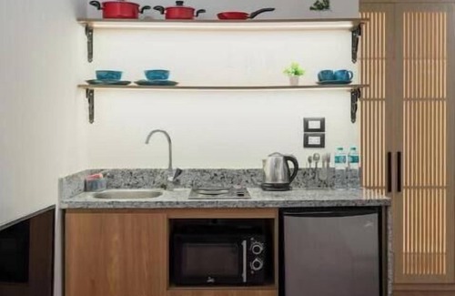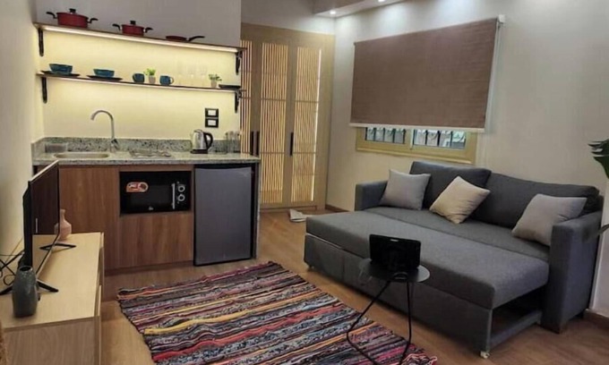 Experience the magic of the Great Pyramids from this modern and cozy private studio designed for relaxation and comfort. Located in the heart of Giza, this stylish retreat offers a private outdoor jacuzzi, a shared swimming pool, and a BBQ area—a perfect blend of luxury and local charm.