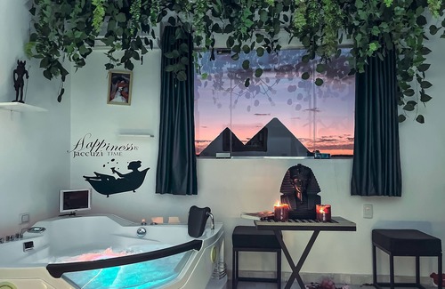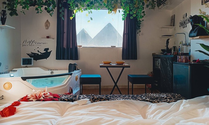 Enjoy magical views of the Pyramids from this deluxe Jacuzzi room in