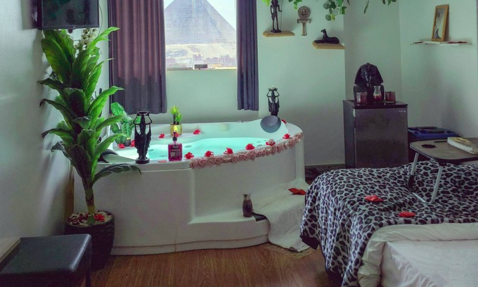 Enjoy magical views of the Pyramids from this deluxe Jacuzzi room in