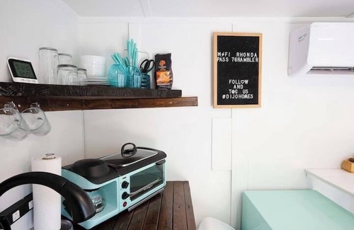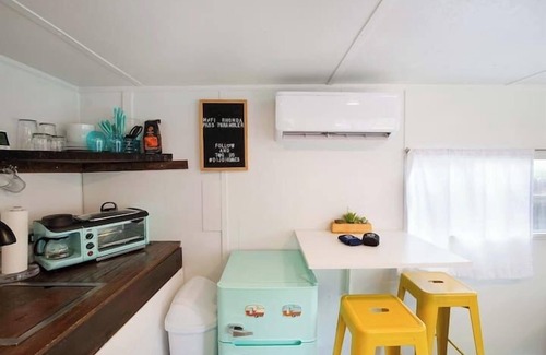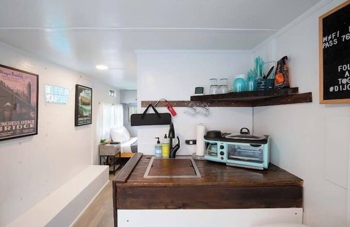 Rhonda is a simple, serene, semi permanent tiny home in our back yard. We have separated out our backyard to create an awesome glamping type experience for Rhonda to live and for all of our guests to enjoy. She has been updated to include a kitchen sink, mini fridge, 32” smart TV, a real toilet and full shower. You'll have access to a private yard with a fire pit and BBQ! Rhonda does sit close to a somewhat busy street & street noise can be heard inside at times.
