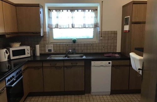 The 80 sqm non -smoking apartment was completely renovated and re -established in 2018. It is located in a single bungalow, without other tenants, in a rural environment. There are two sheep rooms (each with double bed 180x200). Living room with a cozy seating area, a flat-screen TV and a dining area. Free WiFi .. The kitchen is fully equipped (ceramic hob with oven, refrigerator, toaster, microwave, coffee machine and dishwasher). The bathroom has a bathtub, shower, toilet. Separate guests toilet. Washing machine and dryer for free use. For our little guests waiting in the basement, a lovingly furnished scope with toys, children's books, painting things and football kickers. The spacious terrace to the south is ideal for relaxing. A large car parking space right on your doorstep Wheel of wheelchair ramp is available on request.