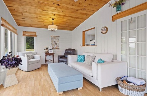 Shoreview Cottage includes two-bedrooms (one with a queen bed and the other with a single over double bunk bed) plus a full kitchen, one and half bath and Wifi. Enjoy the panoramic views from the main sun room and walk-out deck as well.