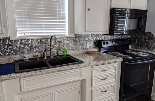 To say this 1950's house is sporting a fresh coat of paint would be an understatement. There has been a complete remodel which includes changes such as new flooring, kitchen counter tops, marble walk-in shower, and new lighting. Brand new furniture came along for the ride including custom tables in the living room and custom beds (queen in one room, two twins in another). The house sits on a beautiful 5 acre property, which is excellent for relaxing.