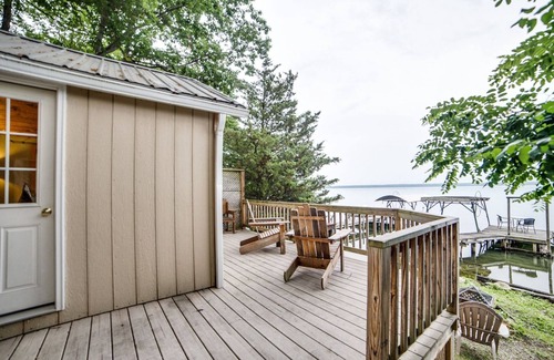 The outdoor space has a great patio for dining and enjoying the view of the lake below. There is also a secondary deck close to the water and a firepit on the shore that you can use for a cozy evening fire. Our cabana building, on the water, is not currently available for guest use.