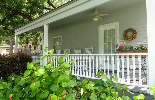 The 'Texas Cottage' at the Comal Inn is nestled in a quiet neighborhood in the heart of New Braunfels, Texas. Located across the street from the beautiful spring-fed Comal River and walking distance to the historic downtown Main Plaza and the world famous Schlitterbahn Water Park. Minutes away by car to Gruene, TX, home of Gruene Hall, the oldest dance hall in Texas. The Texas Cottage sleeps up to 6 guests. The cottage has 2 bedrooms, each with a king size bed and private bath, ceiling fan, and hairdryer. One of the bedrooms has a flat screen tv/cable. The fully equipped kitchen has a stove/oven, refrigerator, dishwasher, microwave, coffee maker, toaster, blender, dishes, cooking utensils, pots & pans, all you need to bring is food. The kitchen, dining area, and living room is an open concept area. The living area includes a flat screen tv/cable, ceiling fan, and a queen size sofa sleeper. The cottage is also equipped with free Wifi, central air & heat, and a washer & dryer. Outside amenities include a private porch with comfortable rocking chairs to sit and relax, an outdoor patio, table with chairs to sit and eat, an outdoor garden area with benches to sit, relax and watch the birds that come feed at the various bird feeders.