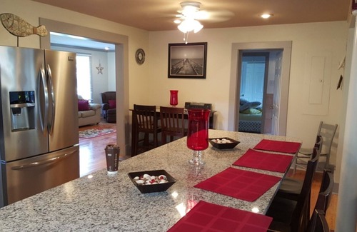 This home is full of character and charm. The flooring throughout the house is original tongue and groove hardwood flooring. The bathrooms are full baths with tile flooring. The kitchen is bright and comfortable and contains granite countertops, stainless steel appliances and is fully equipped for your cooking and entertaining needs. The bar seats 6 along with the dining area seating 4. We have three beautifully decorated bedrooms with spacious closets and two updated bathrooms. This home has a delightful open floor plan with a large kitchen, den and dining room being equipped with everything you may need. It will comfortable sleep 10, with one bedroom being a luxurious bunk room that will sleep 8 comfortable. Our home is equipped with three smart televisions and DVD-Blue ray players. We have a 55 inch in the Den/Kitchen/Dining area, a 42 inch in the living area and 39 inch in the Bunk room for everyone to enjoy their favorite programs. Books, board games, videos are also provided. The laundry room includes a full sized stackable washer and dryer along with an iron and ironing board. All linens, kitchen utensils, small appliances, Wi-Fi, and internet is also available. Child friendly amenities are available free of charge including high chairs, booster chairs and cribs available at your request. Golf carts canoes, kayaks, horseback riding can be rented at nearby establishments if you are interested.