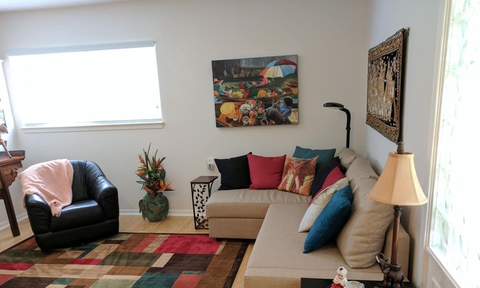 Our 620 sqft charming interior Thai designed cottage is a single building with private parking and path to private entry to our quaint little cottage. It is sitting in a quiet neighbourhood west of Austin and gateway to Texas Hill Country. Our property is surrounded with beautiful natural garden, water features, birds, organic vegetable garden, and lots of trees. It accommodates up to 4 guests with super comfortable king size bed, a comfortable queen size sofa bed and one full bathroom. A kitchenette is equipped with refrigerator, toaster-oven, microwave, coffee maker, and dining sets. There are large flat screen TV with set up for movies, cable, and Wi-FI for your entertainment. It is a great relaxing place to enjoy, either for a get away or a business trip. There are plenty of restaurants and grocery stores within few miles, 2 miles to Hill Country Galleria, 4 miles to St David Hospital in Lakeway, 6 miles to Lake Travis, 8 miles to downtown Austin, and a short drive to Dripping Spring, a gateway to Texas Hill Country. We acclaim our small piece of heaven on earth for a good reason. We had owned restaurants and coffee shop for almost 30 years and we can recommend places you may want to try during your stay. We are only steps away from our little cottage. Come and enjoy for your relaxation and/or business trips "Kob-khun ka" which means " Thank you !"