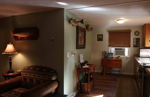 Enjoy an outstanding view down to the river while maintaining the feeling of total seclusion as your nestled within 100' tall hardwood trees. We are set up with 5 beds in 3 rooms (1 queen bed, 2 fulls and 2 twins), a fully stocked kitchen, linens and towels. We cater to those who want to spend a few relaxing days fishing, canoeing, kayaking and golfing. We have fishing guides if you are so inclined, I would not recommend being able to fish on the river in front of our cabin because of the steep access. Unfortunately we do not accept pets.