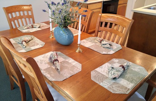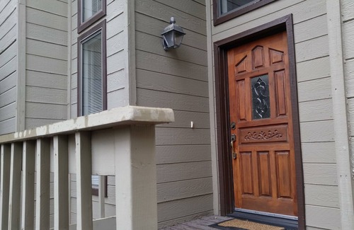 Spacious 2 bedroom 2 bath condo with wood burning fireplace. Fully stocked kitchen with full size refrigerator, range, microwave. Dining room with table that seats six, private deck with barbecue, private garage with remote, upstairs with full bathroom and twin beds, free high speed internet, flat screen tv's in bedrooms and living room (dvd player), beautiful landscaping with tall pines and stream and ponds.