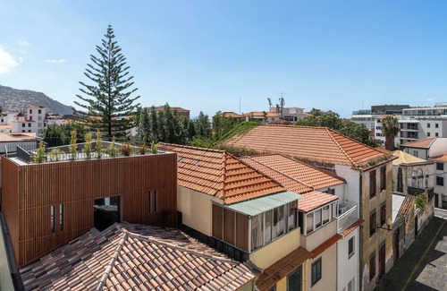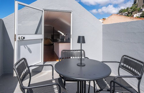 The social area includes a cozy living room and a fully equipped kitchen. Upstairs, there is a lounge space with a desk—perfect for reading or remote work—and access to a balcony with magnificent views over the city of Funchal.