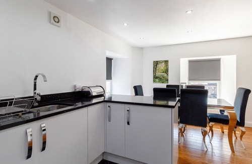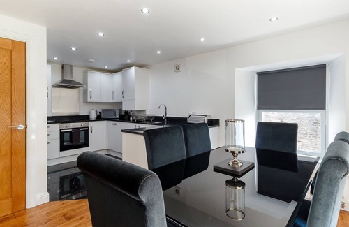 Amenities: Gas central heating. Electric oven and hob, microwave, fridge/freezer, larder fridge, washing machine, dishwasher, kettle, coffee machine and toaster. Media wall featuring 65” 4K LED Smart Ambilight TV with Freeview and Netflix entertainment, WiFi included. Fuel and power inc. in rent. Bed linen and towels inc. in rent. Travel cot and highchair. Non dedicated street parking. Shared, enclosed patio with furniture. Sorry, no pets and no smoking. Shops and pubs 0.1 miles. Note: Children must be supervised when on the balcony! Note: Access to the apartment is via 2 steps through the main front door and up x2 flights of stairs up to the second floor. Note: The second level king-size double bedroom, cinema lounge and second level bathroom are accessed via 1x flight of stairs from the hallway entrance. Note: The patio is shared between all three apartments and there are five steps up to the patio. Please Note - No parties, Stag or Hen Groups.