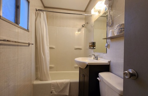 This room includes a queen bed, mini fridge, flat-screen television, microwave, air conditioner, and free wi-fi as well as chairs and a table inside and outside. The room also includes a full bathroom.
